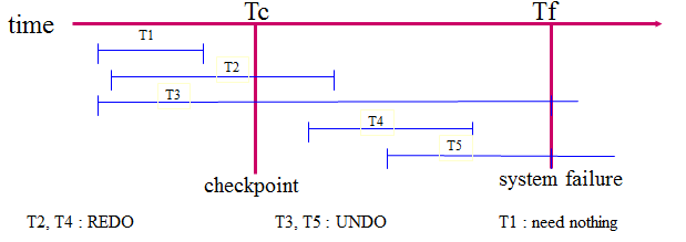 برای روشنتر شدن موضوع به شکل زیر توجه کنید. در این شکل نقطه Tf زمان رخ دادن خطا را در پایگاه داده نشان میدهد. اولین کاری که برای بازیابی باید انجام گیرد، همانطور که گفته شده اینست که آدرس مربوط به زمان checkpoint (Tc) از raster file خوانده شود. پس از این کار از لحظه Tc به سمت Tf شروع به اسکن کردن لاگ فایل میکنیم. بدلیل آنکه در زمان Tc دو تراکنش T2 و T3 در حال اجرا بودند (و نام آنها در checkpoint record نیز ثبت شده است)، این دو تراکنش را در لیست redo قرار میدهیم. سپس عمل اسکن را به سمت پایین ادامه میدهیم. در حین اسکن کردن ابتدا به رکورد start trasnactionمربوط به تراکنش T4 می رسیم. بهمین دلیل این تراکنش را به لیست undo ها اضافه میکنیم. پس از آن به commit تراکنش T2 می رسیم. همانطور که گفته شد باید T2 را از لیست undo ها خارج و به یست تراکنش هایی که باید redo شوند اضافه گردد. سپس به تراکنش T5 می رسیم که تازه آغاز شده است. ان را نیز در گروه undo قرار میدهیم. بعد از ان رکورد مربوط به commit تراکنش T4 دیده میشود و ان را از لیست undo حذف و لیست redo اضافه میکنی. اسکن را ادامه میدهیم تا به نقطه Tf می رسیم. در ان لحظه لیست undo ها شامل دو تراکنش T3 و T5 و لیست Redo ها شامل تراکنش های T2 و T4 می باشند. در مورد تراکنش T1 نیز چون پیش از لحظه Tc کامیت شده است عملی صورت نمیگیرد.